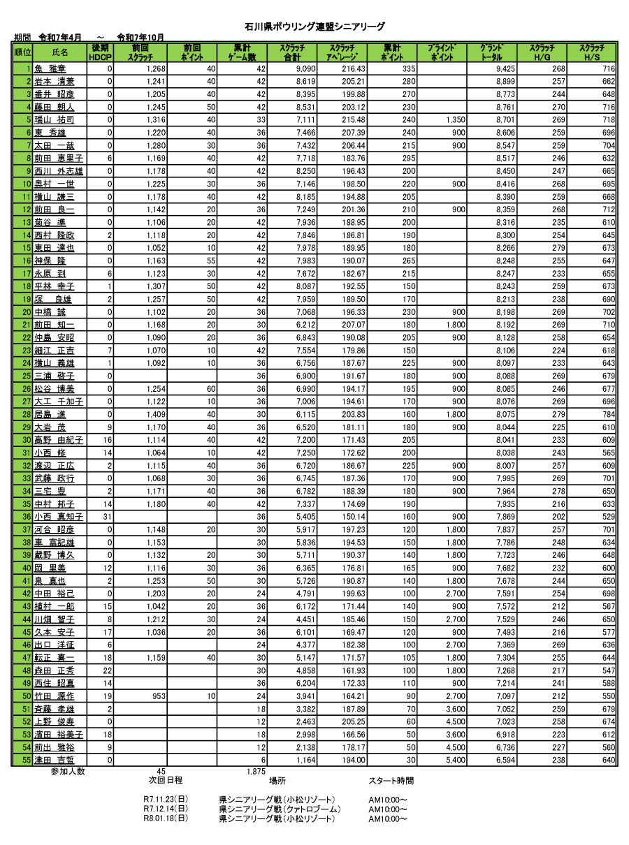 : シニアリーグのリーグ結果を更新しました(令和7年 10月)
