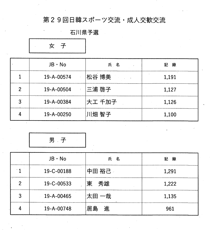 スポーツマスターズ長崎大会 石川県予選(最終結果)