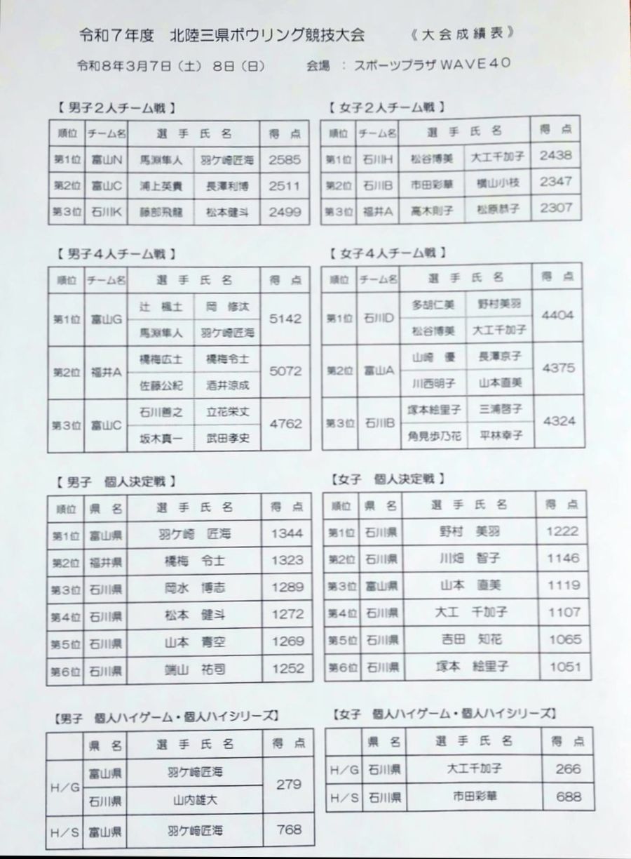 : 令和7年度 北陸三県ボウリング競技大会 大会結果