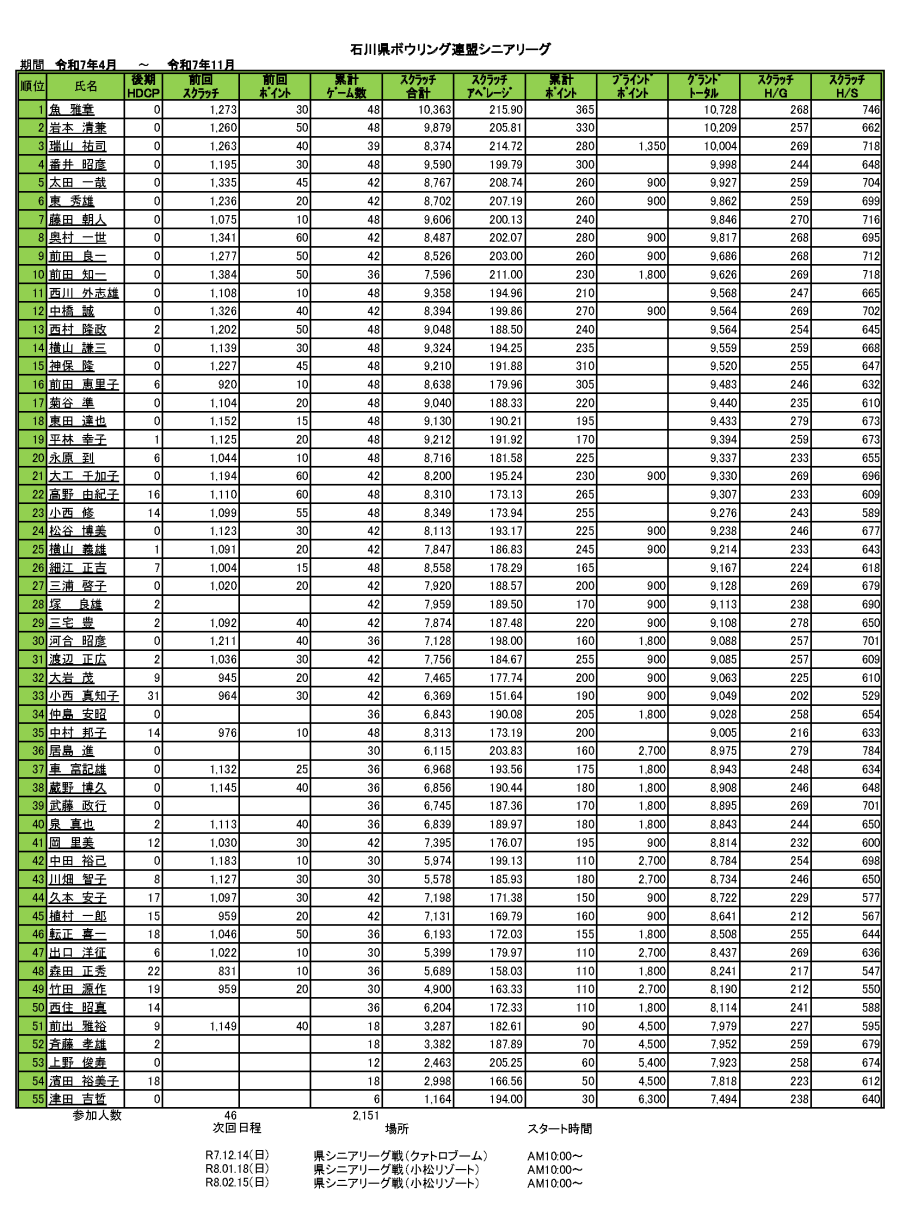 シニアリーグのリーグ結果を更新しました(令和7年 11月)